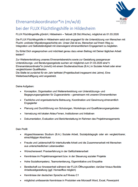 Zur Weiterentwicklung unseres Ehrenamtsbereichs sowie zur Gestaltung passgenauer Unterstützungs- und Beratungsangebote suchen wir möglichst zum 01.03.2026 einen Ehrenamtskoordinatorin (m/w/d) mit einem Studienabschluss (B.A.) in Sozialer Arbeit oder einer vergleichbaren Qualifikation.